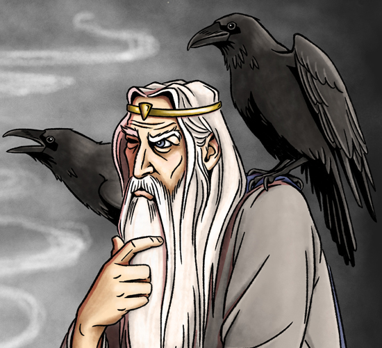 Odin and his two ravens, Huginn and Muninn.