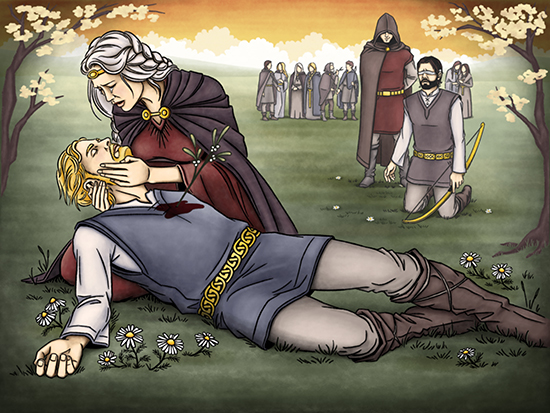 Frigg mourns Baldur's (her son) death. The Völva describes the slaying of Baldur, the most beloved of all the gods. It is a part of the chain of events which ultimately lead to the destruction of the gods at Ragnarök. Höður the blind, Baldur's brother, was tricked and guided by Loki when he shot the mistletoe arrow which slay Baldur.