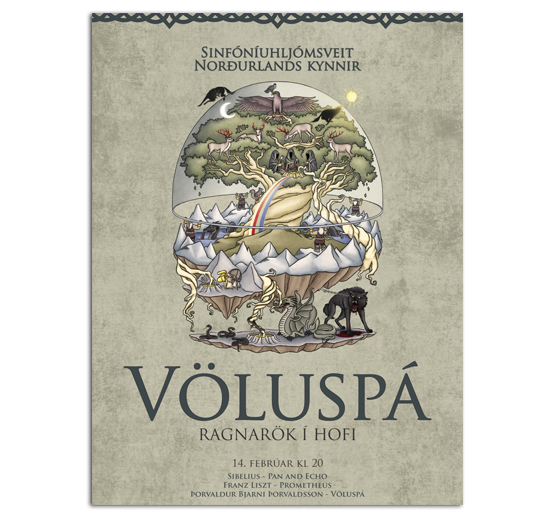 The illustration was used in Menningarfélag Akureyrar's promotional material advertising a symphonic concert, "Völuspá", composed by Icelandic award winning composer/producer Thorvaldur Bjarni Thorvaldsson.