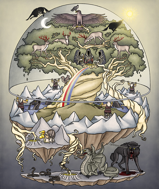 Yggdrasil is an immense ash tree that connects the nine worlds in Norse mythology. The branches of Yggdrasil extend far into the heavens, and the tree is supported by three roots; one extends to the well Urðarbrunnur in the heavens, one to the well Mímisbrunnur located beneath the tree in the land of giants and another root extends to the spring Hvergelmir located in the underworld. (Wikipedia)