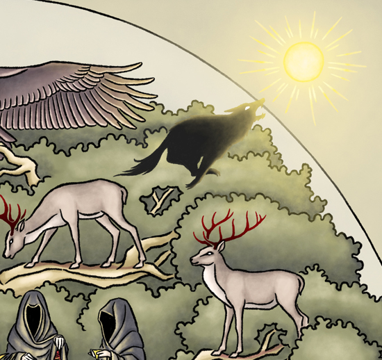 The wolf Hati pursues Sól (the sun) through the sky in hopes of devouring her.