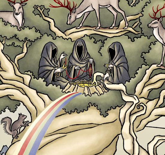 The three norns Urður, Verðandi and Skuld reside at the Well of Urður (Urðarbrunnur) and rule the destiny of gods and men. The squirrel Ratatoskur carries messages between the unnamed eagle perched on top of the world tree and Nidhöggur, the dragon that resides below the world tree.