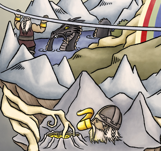 Mímir resides at Mímisbrunnur. Vanir beheaded Mímir and in order to keep Mímir's wisdom, Odin preserved his head with magic. Mímir drinks from the well to gain great knowledge. The sea serpent Jörmungandr (Miðgarðsormur) which Odin tossed into the great ocean encircles Midgard (the world of men). The serpent grew so large that he was able to grasp his own tail.