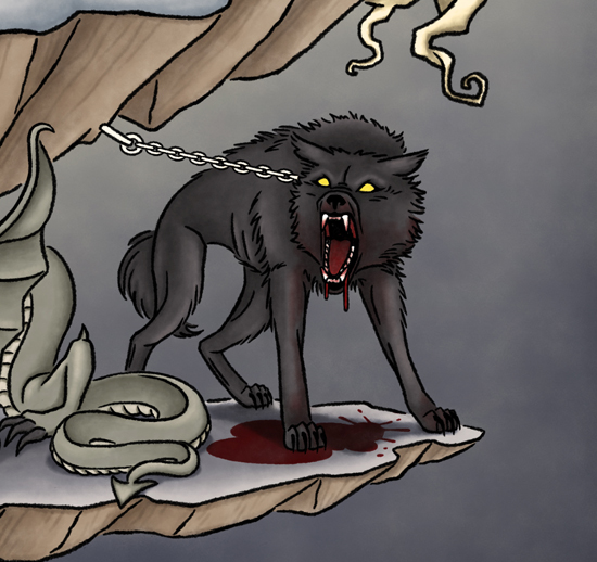Garmr or Garmur, associated with both Hel and Ragnarök, is described as a blood-stained watchdog that guards Hel's gate.